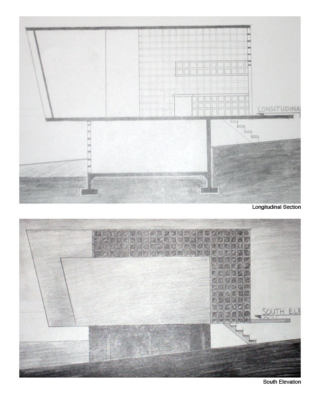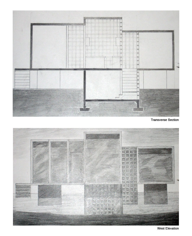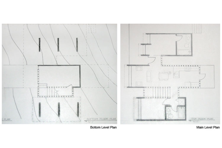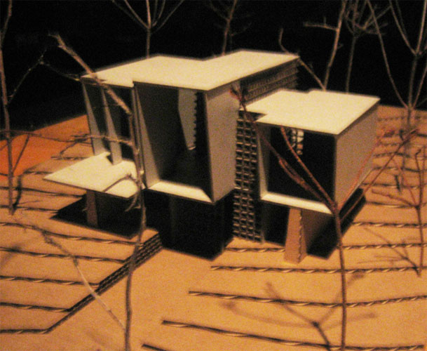 According to program requirements for the studio, the maximum footprint for the rural residence was 250 SF. This parameter caused the building to become a minimal house, with efficiency being a main focus of the design. I utilized cantelevers supported underneath by exterior structural elements to achieve the maximum footprint requrements. The lower level is occupied by workspace, with typical living space on the top level. Unique wall systems in the house are designed to serve as storage in a cube-like structure throughout the house. The main views and axis of the house point to the pond to the west of the house. To facilitate these views while protecting against the glare of afternoon sun, floor to ceiling windows were designed with overhangs for shading late in the day.