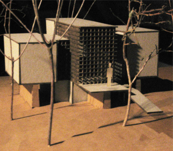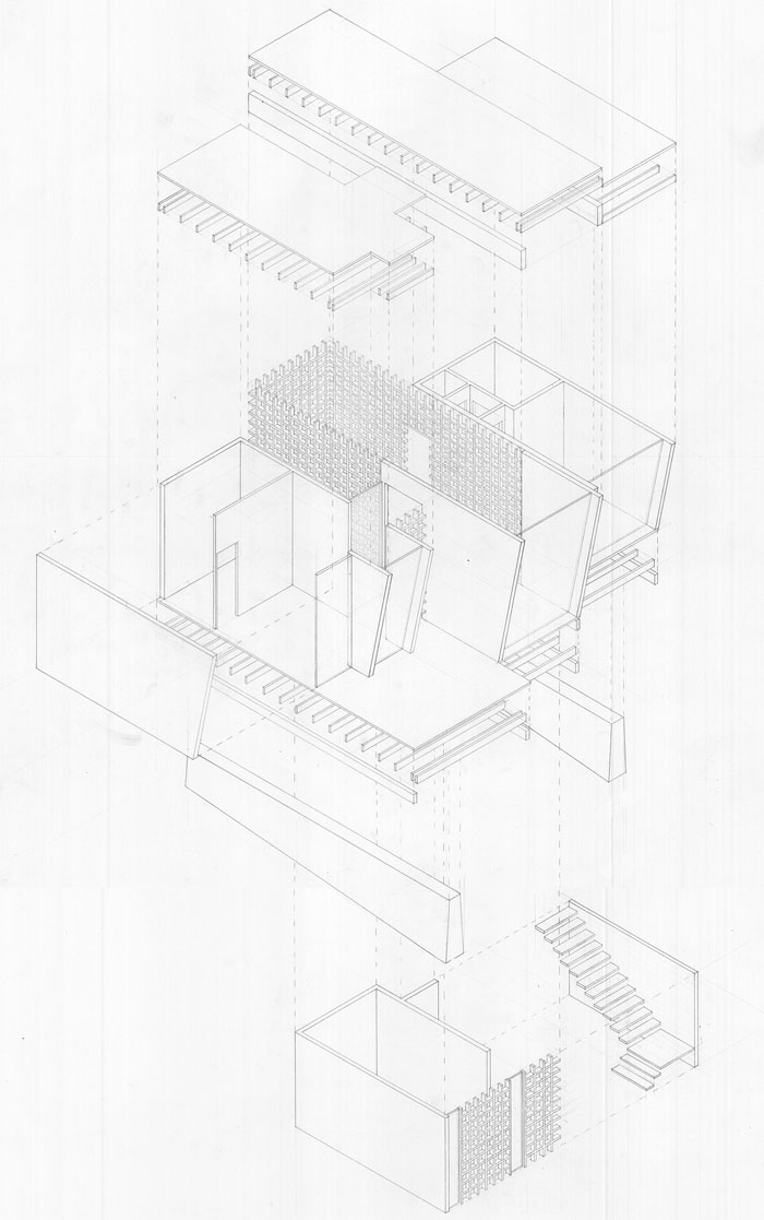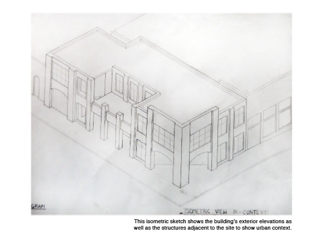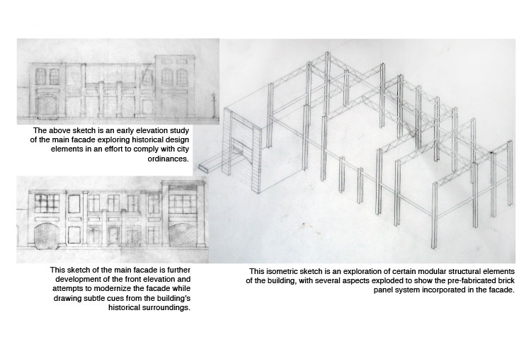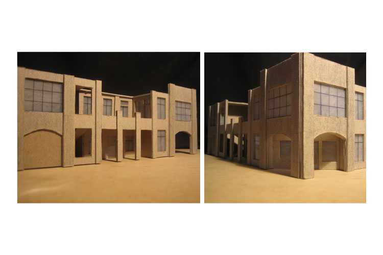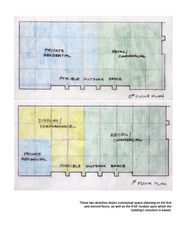The urban residence proposal is a continuation of the proposed rural residence. The same clients need a more urban residence/work environment to meet their varying lifestyles. The new site is in downtown Opelika, Alabama. A building height requirement was set at two stories minimum to respect the historic structures of the area. Additionally, the design was required to include some type of prefabricated architectural element. This requirement creates an ease and efficiency of production, shipping and construction. Because of time constraints at the end of the academic semester, students were encouraged to develop a very schematic floorplan and focus more effort on exploring modularity in structural design and various building elements. My proposal features 1st floor retail space as well as performance/display space and private parking for one vehicle. The second floor is private residence and work space for the clients. I incorporated a modular brick system for ease of construction and based the building plan on an 8’x8’ module.