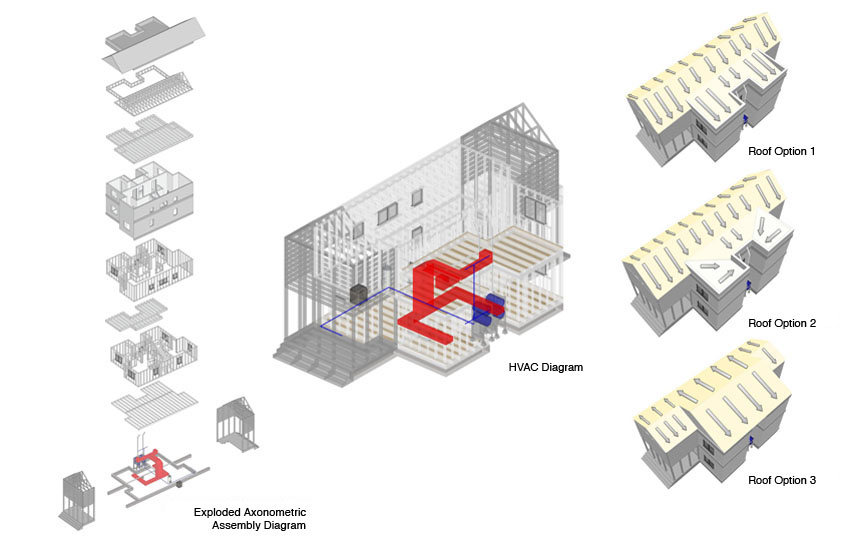 The designs are based on a two foot modular grid with a low initial cost between $40,000-$60,000 that also consider affordable lifetime cost solutions. Simple and straight-forward foundation, floor, and roof plans as well as ease of construction allow active volunteering and community engagement in the construction of the housing prototypes.