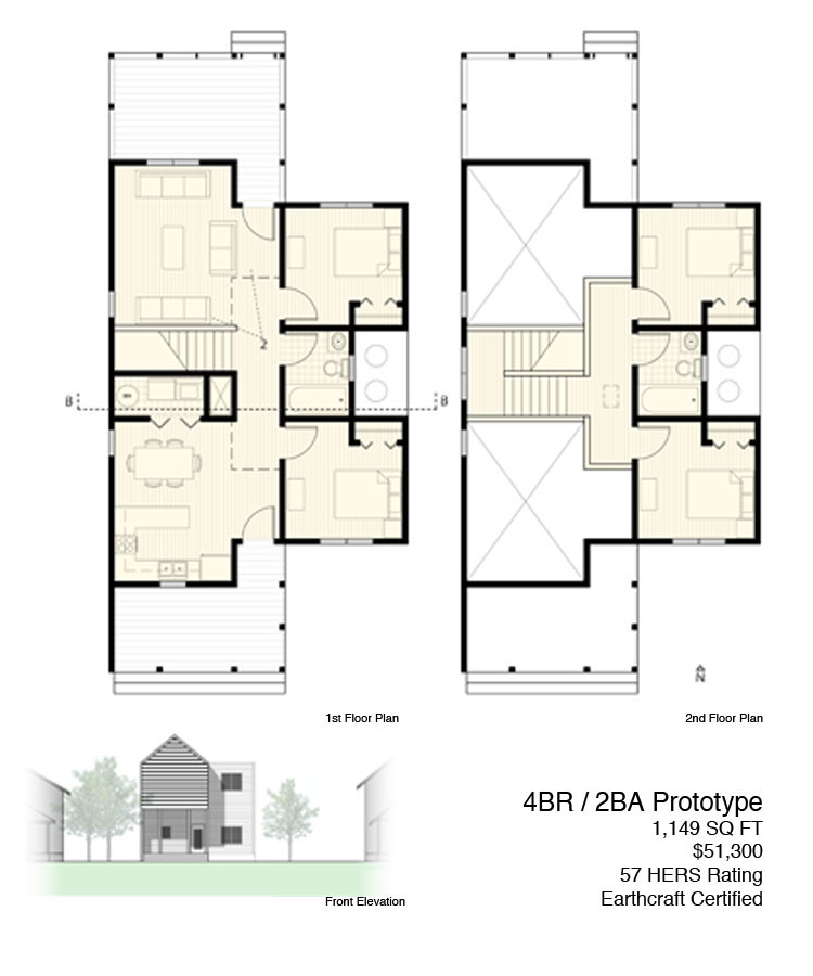 This Design Habitat proposal constitutes three Habitat for Humanity housing prototypes (2BR, 3BR, and 4BR) for an urban infill condition. The goal of these prototypes is to design high performance housing that is environmentally responsive to culture, physical context, and climate in order to conserve energy and money for the homeowner. The durability and quality of the house are primary factors considering the comfort, health, and safety of its occupants.