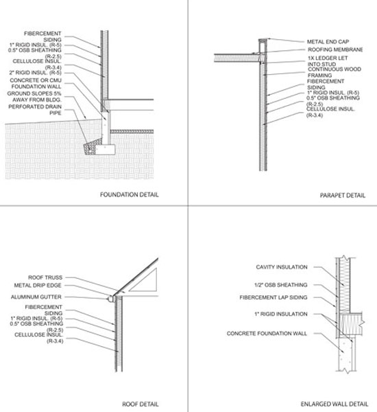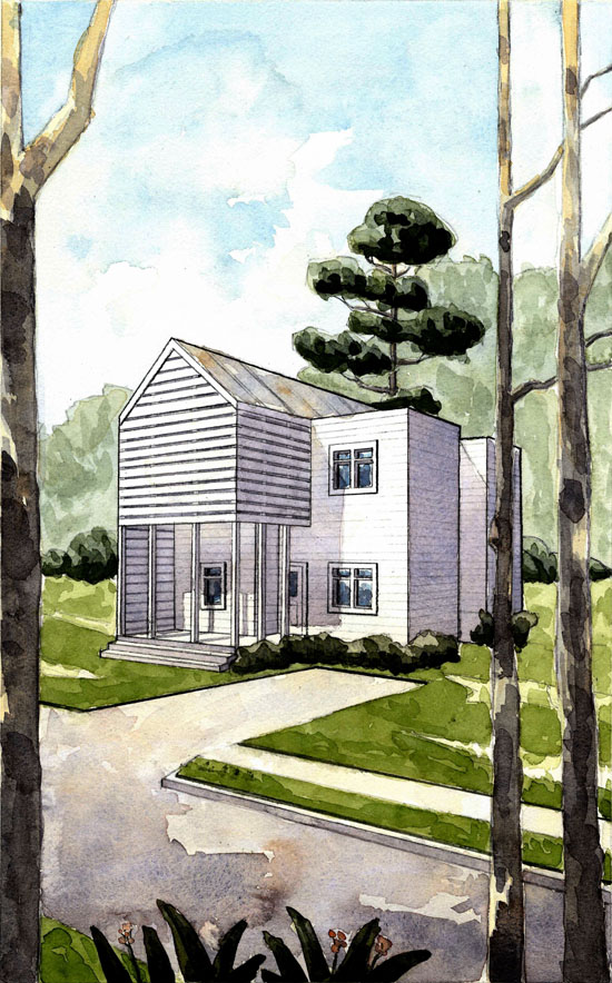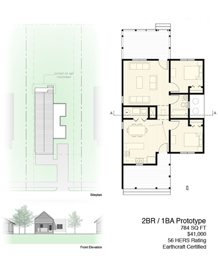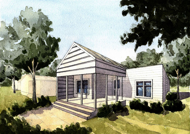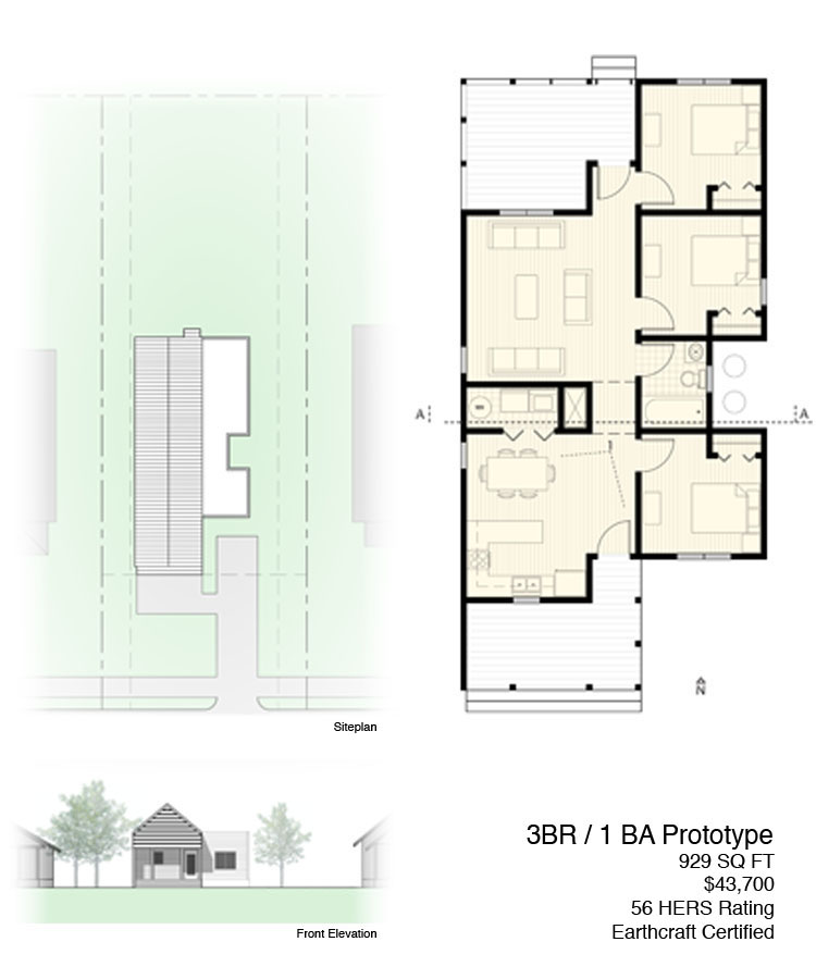 All three prototypes utilize a covered front porch that controls solar gain and enhances social interaction with the surrounding neighborhood, while a screened back porch opens the living area to the back yard, effetively expanding usable living area. The use of light colored building materials acts as a reflective barrier while a rainwater collection system adds additional efficiency. Coupled with operable windows, a whole house fan in the main living space allows for natural comfort ventilation to improve air quality and assist with cooling strategies.