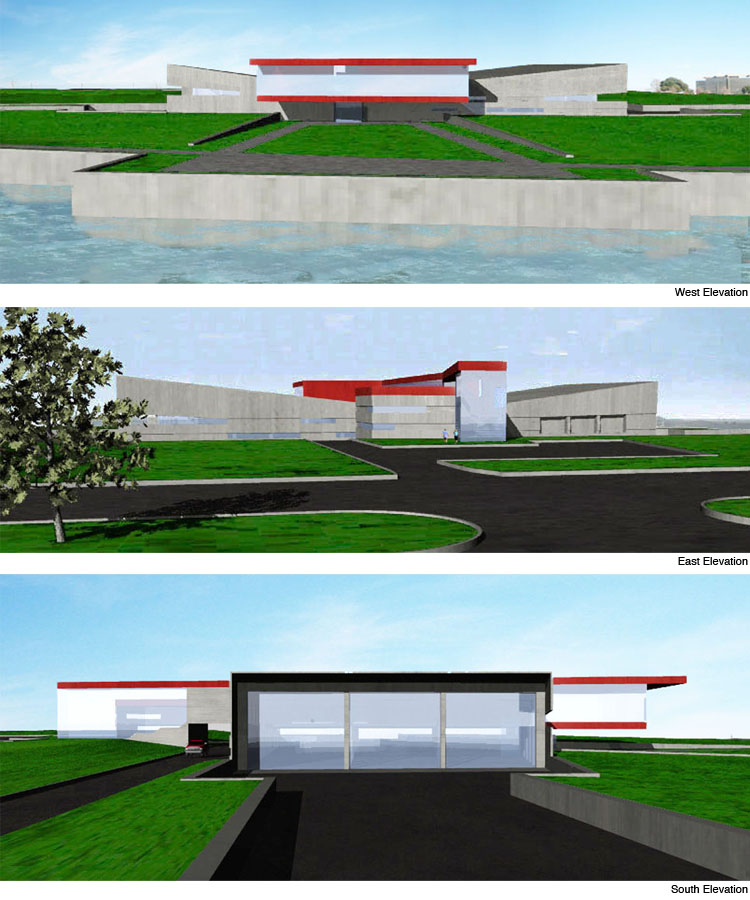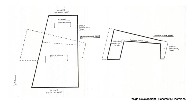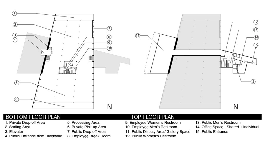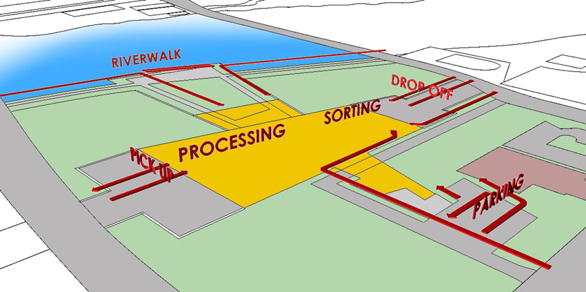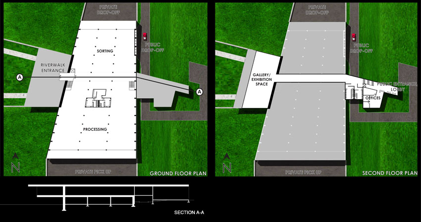 The recycling process was an important element the design of this building, because the building must facilitate recycling in the most efficient way. This proposal features a large, private industrial space on the ground level in which the recycling process takes place. Each end of this space is equipped with loading docks for the delivery and pick-up of recyclable materials. The second level is public, and contains administrative offices as well as a learning center/gallery space that overlooks the Chattahoochee River.